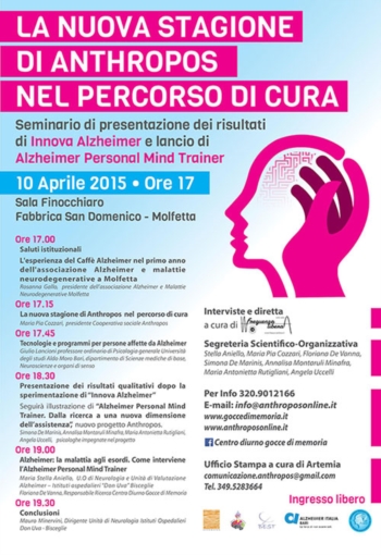 Il seminario proseguirà alle ore 18.30 con la presentazione dei risultati qualitativi del progetto Innova Alzheimer, le psicologhe della Cooperativa sociale Anthropos: Simona Demarinis, Annalisa Montaruli Minafra, Maria Antonietta Rutigliani, Angela Uccelli illustreranno i benefici e l’utilità della sperimentazione in relazione alla dimensione famiglia nella malattia di Alzheimer.